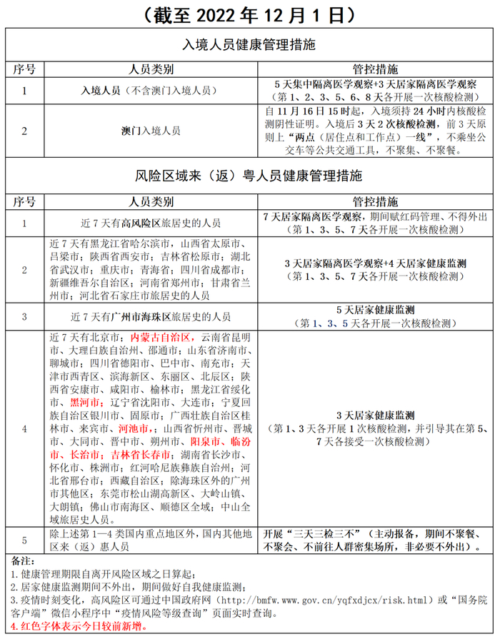 当前国内疫情形势严峻复杂,我市已发生多起外省、市输入疫情,“外防输入、内防反弹”的压力显著增大。请广大市民继续履行个人防控责任,坚持做好勤洗手、戴口罩、勤通风、一米线“防疫四件套”,做好自身健康“第一责任人”,保护好自己和家人尽量避免感染的风险就是为疫情防控做出贡献。戴口罩进入公共场所,并自觉遵守测温、扫场所码、查验行程卡等各项疫情防控措施。高风险区、疫情传播严重地等来(返)惠人员严格按照我市防疫政策配合做好健康管理(详见以下表格),其他地区来(返)惠人员抵惠后落实“三天三检三不”(核酸三天每天一检,期间不聚餐、不聚会、不前往人群密集场所,谢绝访客)。