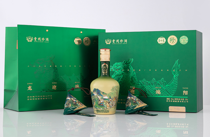 此外,贵州珍酒还结合中国传统节日进行文创设计,推出“珍酒·龙迎端阳”,以清朝乾隆时期画册《端阳故事图》其一《观竞渡》为蓝本,用烫金浮雕工艺层层勾画出山峦层叠、垂垂杨柳、划船竞渡、守看龙舟的端阳节场景。