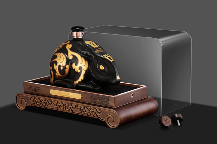 今年,珍酒延续了与珍贵文物结合的方式,以观复博物馆《错金银兔形镇》为灵感来源,推出兔年生肖酒“珍酒·错金兔”。珍酒·错金兔器型轮廓分明、线条流畅,兔形呈俯卧状,头部微抬、兔鼻隆起、双目圆睁、兔耳贴背、弓背丰臀、前肢点地、后腿弯曲,似随时一跃而起。兔身以错金银手法表现兔子纹饰,呈现精美细致、栩栩如生的效果。