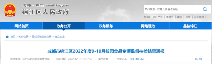 成都市锦江区市场监督管理局通报2022年度9-10月校园食品专项监督抽检结果