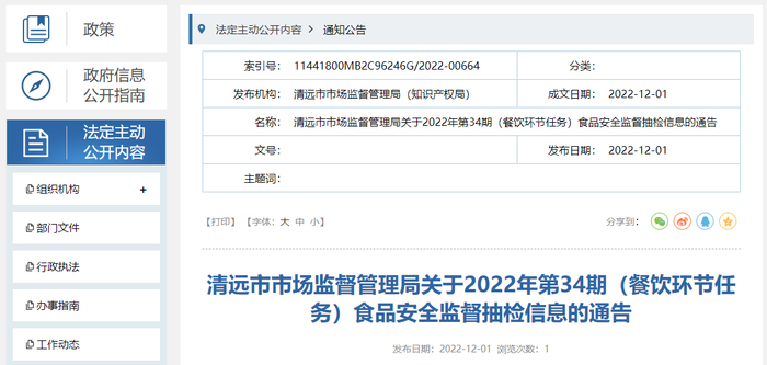 广东省清远市市场监管局关于2022年第34期(餐饮环节任务)食品安全监督抽检信息的通告