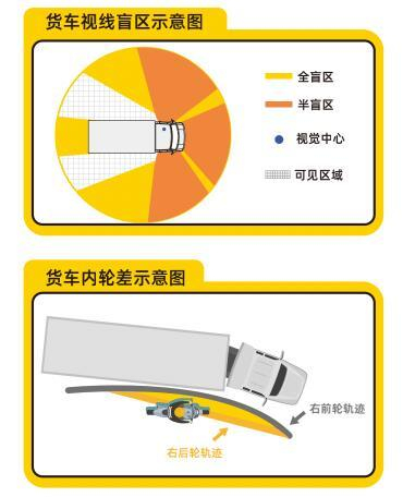 《报告》中指出,电动自行车骑行驾驶人要特别注意识别大货车“盲区”。大货车右侧转弯时形成的“内轮差”盲区,又被称为“死亡盲区”,如果电动车驾驶人在大货车右侧骑行,被卷入车底的可能性就非常大。