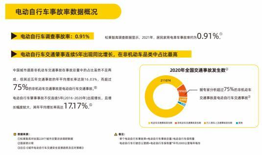 然而,随着电动自行车的普及,事故率也不断攀升。松果智库对全国228个城市交警访谈的数据显示,当前电动自行车事故率达0.91%。同时,报告显示,电动自行车交通肇事连续五年出现同比增长,在非机动车品类中占比达75%。