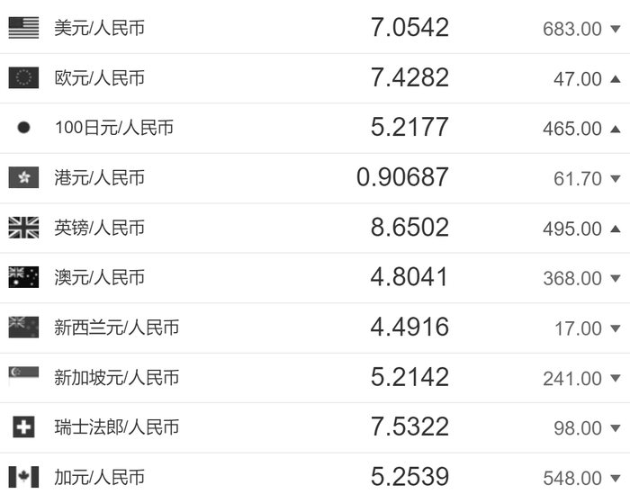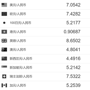 中国人民银行授权中国外汇交易中心公布,2022年12月2日银行间外汇市场人民币汇率中间价为:1美元对人民币7.0542元,1欧元对人民币7.4282元,100日元对人民币5.2177元,1英镑对人民币8.6502元,1澳大利亚元对人民币4.8041元,1新西兰元对人民币4.4916元,1新加坡元对人民币5.2142元,1瑞士法郎对人民币7.5322元,1加拿大元对人民币5.2539元。
