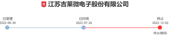 今日,江苏吉莱微电子股份有限公司(“吉莱微”)IPO终止,连第一轮反馈意见都没有回复。深交所网站显示,第一轮问询在2022年7月26日发出,11月30日,公司及保荐机构向深交所撤回申报/保荐。