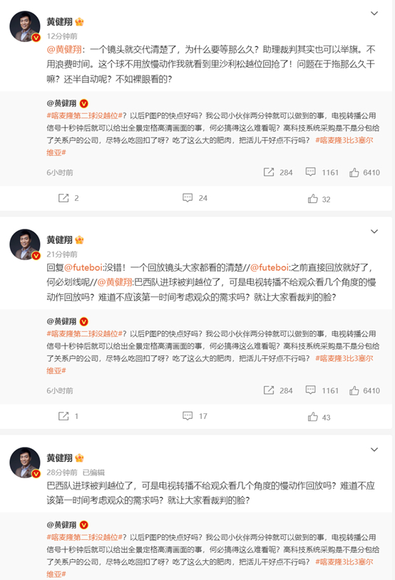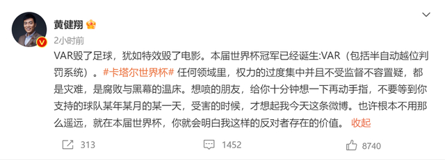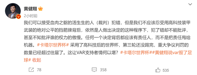 12月1日,体育评论员、节目主持人黄健翔在个人社交账号上发文称,“VAR毁了足球,犹如特效毁了电影。本届世界杯冠军已经诞生:VAR(包括半自动越位判罚系统)。任何领域里,权力的过度集中并且不受监督不容置疑,都是灾难,是腐败与黑幕的温床。”