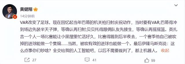 对此,黄健翔多次发文质疑,“VAR改变了足球。现在回忆起当年巴蒂的机关枪扫射庆祝动作,当时要有VAR,巴蒂得冲到场边先装半天子弹,等确认再扫射;贝贝托得跟俩队友先接生,等确认再摇摇篮。英扎吉一个人一场比赛能让小黑屋里忙活好久,比赛得踢到后半夜去,一个赛季他自己被吹掉的进球能做一个集锦……当然,被吹有效的进球也能做一个。最后伊隆马斯克说:这么点事你们吵啥?全交给我的人工智能吧,以后不需要裁判了,都上机器人。