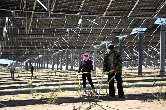 在位于甘肃省武威市凉州区的甘肃武威50万千瓦立体光伏治沙产业化示范项目建设现场,工人给光伏板下沙生植物浇水。(资料)
