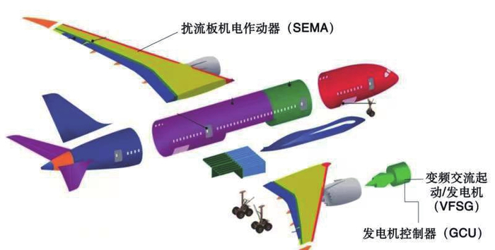 另外,波音787还采用了很多新技术以及创新的设计和架构。几个比较突出的技术创新包括变频交流起动/发电机(VFSG)、高功率发电系统、扰流板电动作动器、复合材料机身制造。