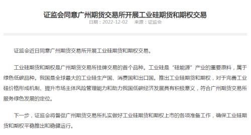 证监会12月2日发布通知,同意广州期货交易所(以下简称广期所)开展工业硅期货及期权交易。工业硅期货和期权是广州期货交易所挂牌交易的首个品种。