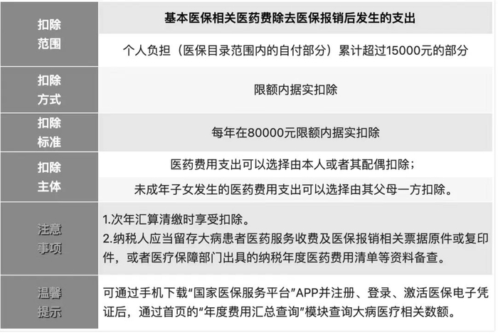 纳税人本人或其配偶、未成年子女发生的与基本医保相关的医药费支出,在扣除医保报销后,自付部分本年度累计超过15000元,且不超过80000万元的部分,准予在计算个人所得税应纳税所得额时扣除。
