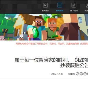 据中国证券报报道,12月2日下午,网易旗下知名游戏《我的世界》官方发布消息称,《我的世界》诉《迷你世界》抄袭一案终审获胜。