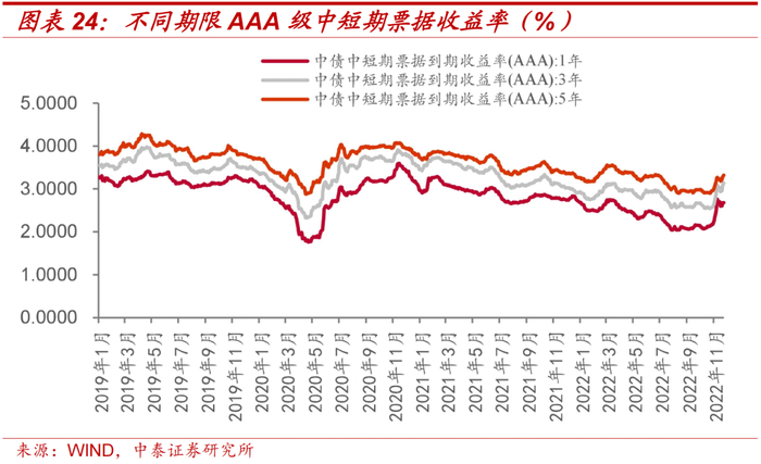 本周1年期、3年期、5年期中短票据收益率均有所上行。具体来看,本周AAA评级1年期、3年期、5年期中短票据分别收于2.68%、3.14%、3.32%,较上周分别上行7.64bp、19.61bp、13.41bp。