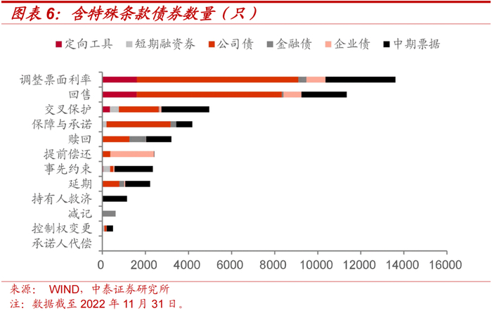 从单项条款来看,调整票面利率、回售、交叉保护条款的出现次数位居前三名。调整票面利率由于其具有的伴随性质,往往与回售、赎回、延期等条款同时出现,故含有调整票面利率的存量债较多。由于近年来监管力度加强、投资者保护要求提升,含有交叉保护、保障与承诺(包含偿债保障承诺与事先承诺)等投资人保护类条款的债券数量也较多。