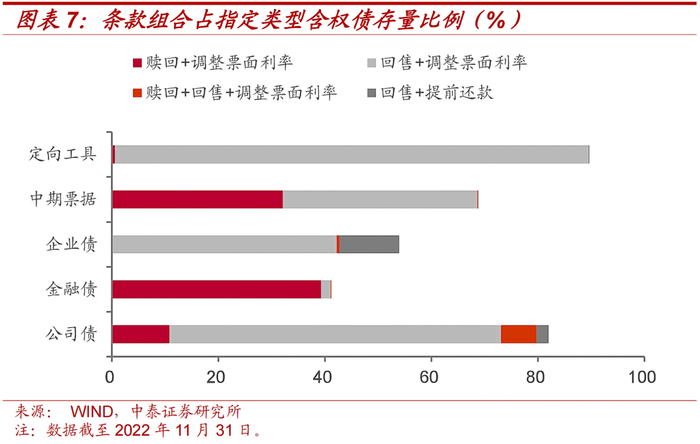 从条款组合来看,具有赎回、回售、调整票面利率、提前还款四种条款组合的债券,在含权债中占比较高。接下来,我们分债券类型计算了各类条款组合在该类含特殊条款债券存量余额中的比例。