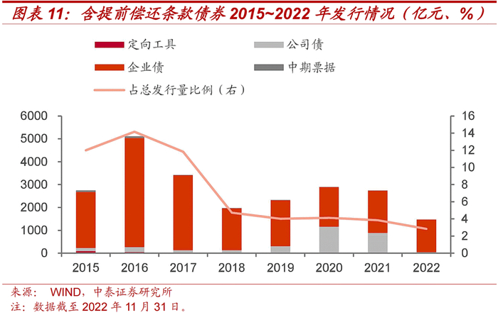 从发行情况来看,提前还款条款常见于含权债发展初期,2016年发行规模最大,超过5000亿元,当年发行量占全部含权债比重接近15%。但随着含权债发展,提前还款条款发行规模占含权债比例逐年下降,规模也没有出现大幅增长。近几年提前还款条款占全部含权债比例约4%,仍然是较为常见的条款之一。