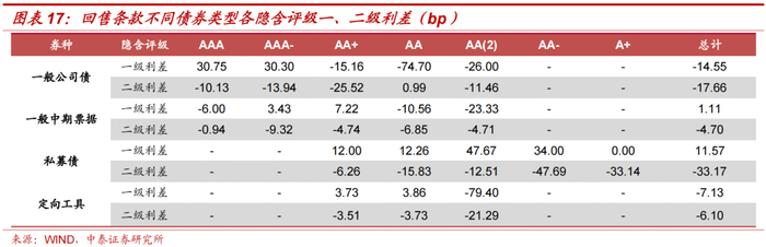 从一级利差上看,整体上一级利差大多是负数,这支持了回售条款对投资者有利的判断。回售条款作为一种投资者权利,赋予了投资者在行权日到来时更多的主动权,即投资者可以依据行权日前后利率环境考量是否行权。但其中,私募债出现一级利差都是正的情况:首先可能是因为选取的多数债券组合发行时间间隔久,即发行时间间隔跨度较大、基本接近1年,而票面利率受利率环境变化影响较大;其次,调整票面利率条款作为回售的伴随条款,也会对票面利率产生影响。分隐含评级看,隐含评级相对较低的AA与AA(2)基本都为负。AA与AA(2)评级的样本相对其他评级更多,因此更能分散其他因素对票面利率的影响,一级利差结果也进一步支持了回售条款对投资者有利的判断,即回售条款的存在一定程度上会降低票面利率。
