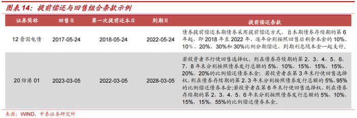 提前还款条款常见于企业债,赋予投资人能够分期提前偿还本金的权利。提前还款条款因其条款性质,常见于期限较长的债券中,能够缓解企业建设大型项目时的偿付压力。各类期限债券提前偿还时点及对应偿还比例具有一般性规律,当回售条款与提前还款条款同时出现时,若回售日处于提前偿还各时点之间,那么尚未发生兑付时点的偿还比例通常会随着债券回售情况而发生变化。
