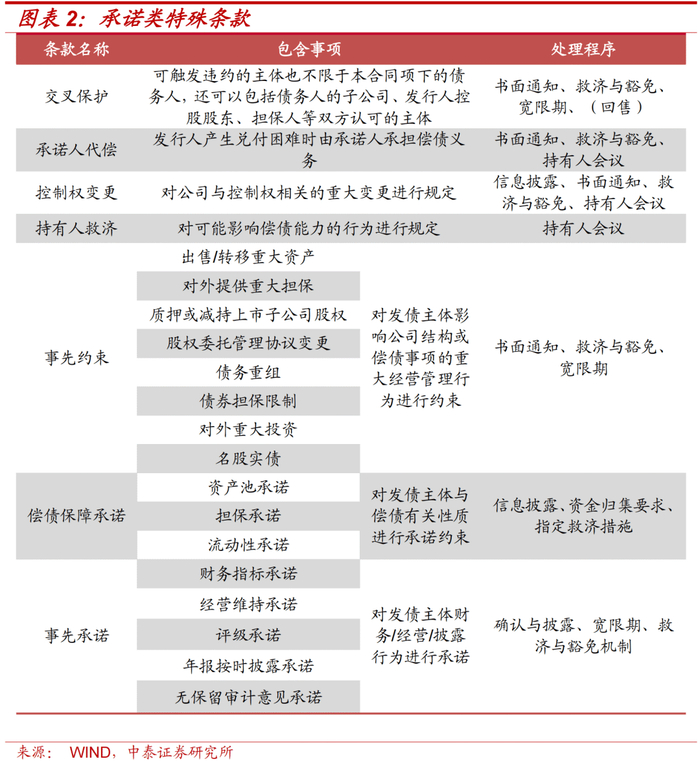 承诺类条款均为非选择性条款,此类条款没有明确行使权利的主体或选择是否行使权利的行为规定,主要为对发行人的规定或发行人做出的承诺,具有投资者保护性质。承诺类条款主要包括交叉保护、事先承诺、持有人救济、事先约束等,通常对公司生产经营重大事项、或影响公司偿债能力的行为和指标进行规定和约束,列示触发事项,规定处理程序,用以在发债主体出现风险时保障投资者权益。