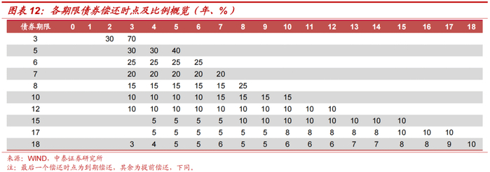 从偿还时点与比例来看,各类期限债券提前偿还时点及对应偿还比例具有一般性规律。例如,5年期债券的提前还本条款一般将还款时点设置在债券存续期的第3、4、5年末,且对应的偿还比例一般为30%、30%、40%;7年期债券的提前还本条款一般将还款时点设置在债券存续期的第3、4、5、6、7年末,且每年末对应的偿还比例一般都为20%。
