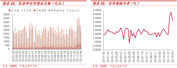 本周信用债市场成交活跃度有所下降。本周信用债周度换手率为3.72%,较上周下行102个bp。分券种看,企业债、公司债、中期票据、短期融资券和定向工具成交量分别为481.67亿元、3057.70亿元、2995.19亿元、2319.76亿元和910.09亿元,企业债、公司债、中期票据、短期融资券和定向工具成交量较上周均有不同程度下降。