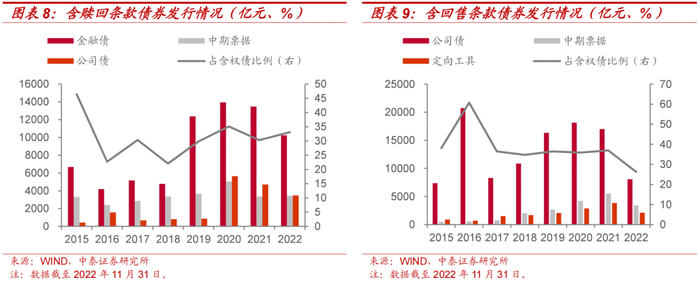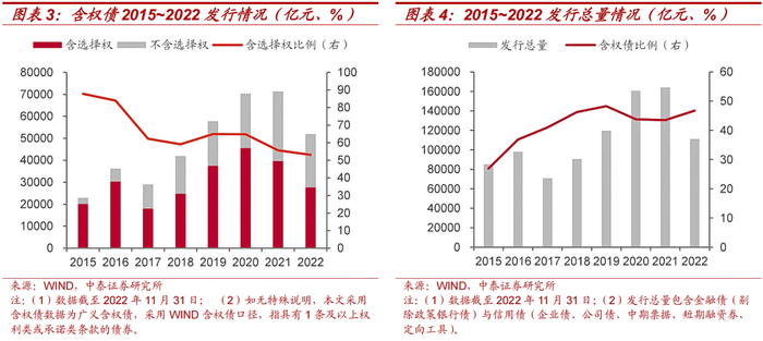 我们选取2015年至今的数据,观察含权债的发展情况和占全部信用债的比例,并区分了是否含选择性条款的债券进行分析。从含权债发行规模来看,含权债发行规模自2017年起不断上升,2021年开始有所回落。其中,含选择性条款的债券占全部含权债比例虽一直保持下降态势,但占比始终超过50%。从含权债占发行总量比重来看,含权债占信用债与金融债总发行量比重从2015年起稳步上升,至2019年开始有所回落,近年出现小幅上升。