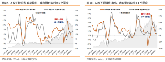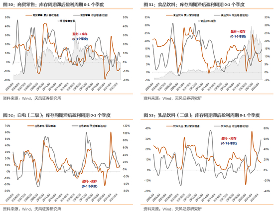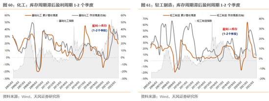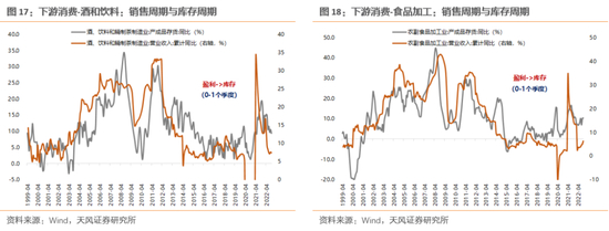(3)企业的周转率高低。对于周转快、效率高的企业,产能调整和存货调整也会更快,特别是轻资产运作或产业链上下游环节较短或离C端较近的企业,一般库存周期与盈利周期的同步性也会较好,存货滞后盈利0-1个季度不等——典型的是偏下游的行业,比如食品制造业、酒饮料和精制茶制造业、农副食品加工业、纺织服装和服饰业等。