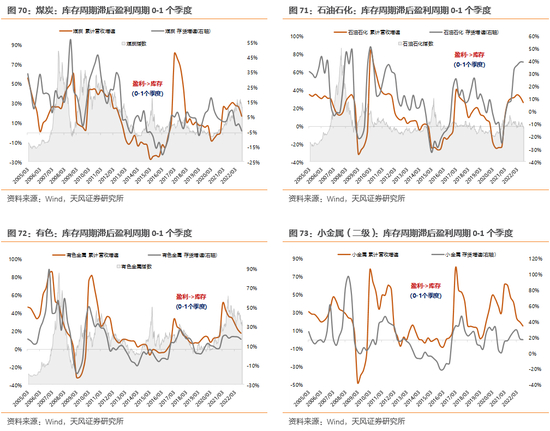 (2)企业存货计价方式。存货的计价方式对存货价值也有影响,对于有市场化公允价值的环节,一般存货周期与盈利周期的同步性比较好,存货滞后盈利0-1个季度不等——典型的是上游资源品开采和冶炼环节,比如:有色金属矿采选业和冶炼加工业、黑色金属矿采选业和冶炼加工业、煤炭开采和石油煤炭加工业等。