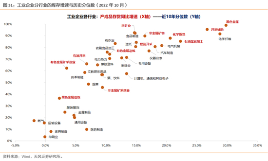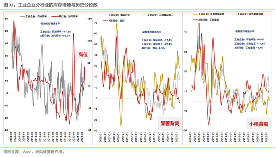 案例一:上游周期资源品——分化但普遍较高。当前工业企业库存数据显示,上游能源普遍库存位置比较高,其中煤炭开采、石油开采、黑色金属、有色冶炼、石油煤炭加工的库存增速位于历史81%、66%、99%、74%、85%分位。