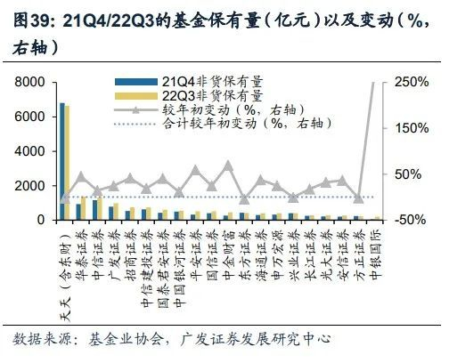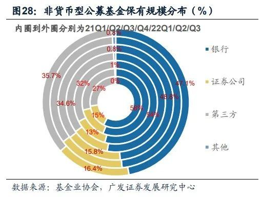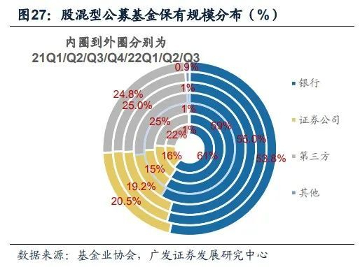 从基金业协会披露的公募基金保有量来看,证券公司占比呈现持续提升态势,前百家中,证券公司保有的非货型公募基金产品由21Q1的14.8%提升到22Q3的16.4%,股混型产品优势更为凸显,由21Q1的16.1%提升至22Q3的20.5%。