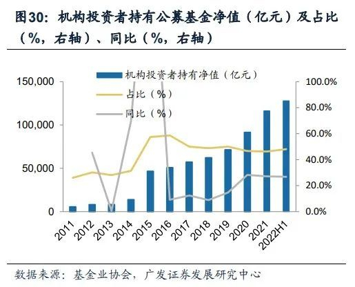 TO B基金代销呈现较强的成长性,联动机构客户综合服务能力的提升。随着保险资管等机构投资者的壮大及公募FOF与银行理财子公司的成长,机构投资者对于公募基金的需求进一步提升,截至2022H1,机构投资者持有公募基金净值达12.8万亿元,同比+26.8%,占公募基金规模的48.1%,显示出较强的成长性,进而带动公募基金2B代销业务的增长。