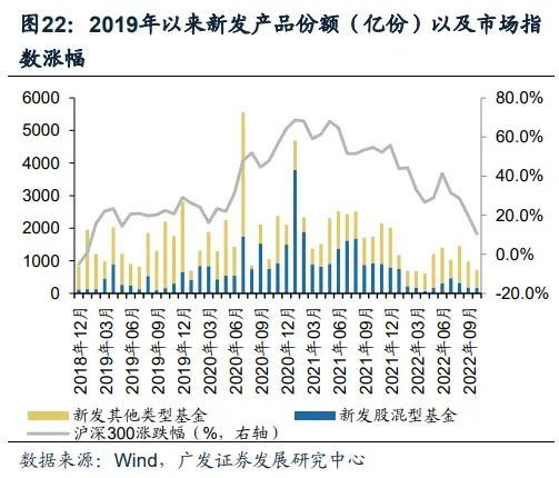 市场波动显著影响公募基金的产品结构变化。今年以来截止11月26日,沪深300累计下跌23.6%,同期新发产品累计1.03万亿份,同比下滑59%,其中新发股票型及混合型产品累计0.29万亿份,同比下滑81%。公募基金产品发行及投资者申赎行为仍有较强随行就市特征,若权益市场有望底部回暖,权益型基金产品新发及占比有望趋于抬升,但同时资管机构应警惕部分产品的阶段性赎回压力。