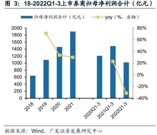 2022年是本轮资本市场深化改革以来的首次盈利回撤年。2019年以来,资本市场显著扩容,投、融资两端的改革加速落地,2018年-2021年41家上市公司三年营业收入CAGR为29%,归母净利润CAGR达到43%。2022前三季度资本市场震荡下行,41家上市券商实现营业收入和归母净利润分别同比-21.0%和-31.2%,主因是泛自营投资显著拖累,泛财富管理盈利收缩。