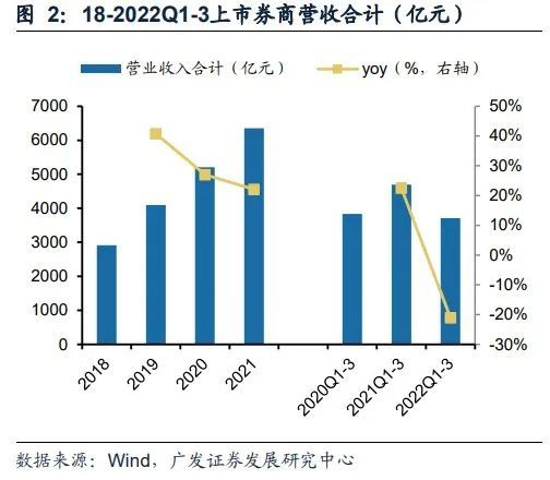 2022年国内经济发展面临“需求收缩、供给冲击、预期转弱三重压力”,资本市场表现震荡下行,证券行业面临资本市场深化改革以来首次盈利回撤。2022前三季度,41家上市券商实现营业收入和归母净利润3710.38亿元、1021.25亿元,分别同比-21.0%和-31.2%。
