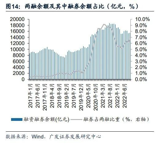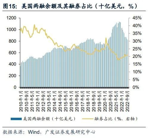 更加灵活的、市场化的融券制度拉动融券余额,优化两融结构。科创板及创业板实行注册制后,全市场融券比例占两融余额快速提升,到2021年5月的高点,融券余额达到1517亿元,占比达到9.8%。截止2022年10月31日,融券余额为1039亿元,占比达到6.7%。对比注册制的成熟市场美国,融券余额占比较高,截止2022年10月,融券余额为1730亿美元,占比为21%。