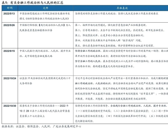 当前,党中央政策方面对金融行业的指引突出强调“金融工作体现政治性和人民性”。11月4日,证监会在召开学习贯彻党的二十大精神宣讲报告会中提到“紧紧围绕建设中国特色现代资本市场这一重大时代课题,聚焦坚持和加强党对资本市场的全面领导、深化资本市场改革、扩大高水平制度型开放、更好服务高质量发展和高水平科技自立自强等重点问题加强研究”;11月17日,银保监会在部署全系统学习宣传贯彻党的二十大精神工作中提到“加强和完善现代金融监管,自觉践行以人民为中心的发展思想,持之以恒防范化解重大金融风险”。