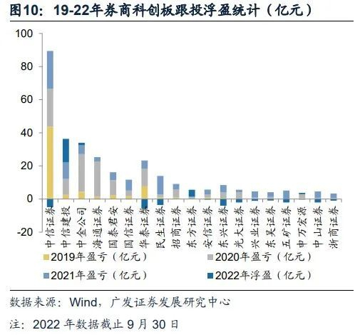 注册制为券商链接的优质企业资产找到了退出渠道,而跟投制度使得券商的优质资产获取、定价能力得以快速变现。注册制下一级私募股权子公司的项目退出路径更加畅通,有助于券商完善对企业的全生命周期融资服务,利好优质资产获取和投资定价能力强的头部券商进一步增厚收益。据我们测算,科创板跟投券商合计2020年、2021年分别获得跟投浮盈为135.5亿元、114.2亿元。