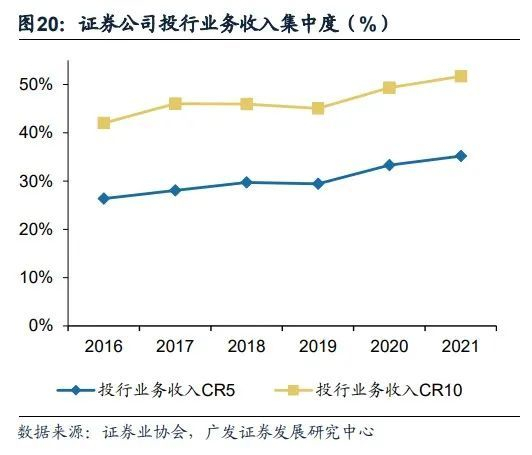 注册制后更加强化了对券商综合服务能力的要求,预计机构业务布局深入与协同能力强的头部券商更加受益。完善对企业客户的服务需协同打造以风险投资、股权融资、债券融资、并购重组、资产证券化、资本中介、资产管理等为核心的综合金融服务体系。投行业务作为链接一级、二级业务的枢纽与服务企业客户的核心环节,头部券商加大布局与人员投入、在优质资产获取与定价发行能力上巩固优势壁垒,投行业务集中度持续提升。