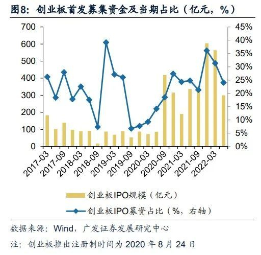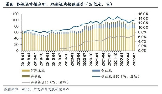 注册制变革推动“双创”板块市值快速增长。截止2022年10月31日,创业板总市值占全A比重达到13.3%;科创板总市值占全A比重达到8.0%,合计达到21.3%。