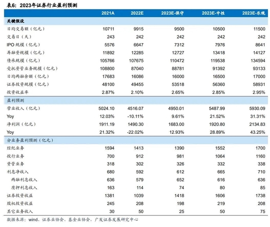 对2023年券商行业在保守、中性、乐观情景下做出以下核心假设: