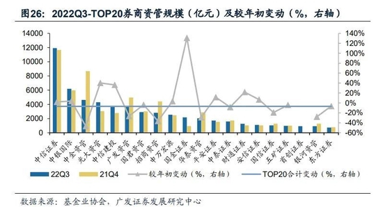 受客群、产品结构及机构投研能力禀赋的影响,券商资管分化发展。截止2022Q3,TOP20的券商资管私募资管规模合计为5.73万亿元,较年初(21Q4)下滑6.9%。其中不同券商的管理规模变动差异较大,增速较高的有国金证券、光大资管、中信建投证券,分别增长131%、40%、36%。