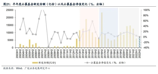 公募基金在长期规模增长的趋势下,其增长速率呈现周期性特征。截止2022年11月25日,公募基金资产净值达到26.6万亿元,较年初增长4.5%,2003年-2021年的年化复合增速为32%。但在长期中高速增长下,公募基金的规模增速也呈现周期性波动的特征。受到市场周期性波动的影响,公募基金的产品新发节奏以及产品净值表现均呈现波动特征,从而公募基金总体规模增速也呈现周期波动特征。复盘历史,随着公募基金规模的壮大,一方面其增速的波动周期逐渐拉长,以两个增速底部间时限为一个波动周期,周期由1-2年向2-3年延展;另一方面其增速波动的幅度趋于平缓。