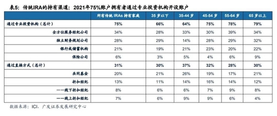 传统IRA的持有家庭中大部分通过专业财富管理机构购买,产品类型较为丰富、税收优惠形式较为多样,专业投资机构更能满足家庭的个性化养老需求,其中全方位服务经纪公司因能提供多方位的服务而最受欢迎。