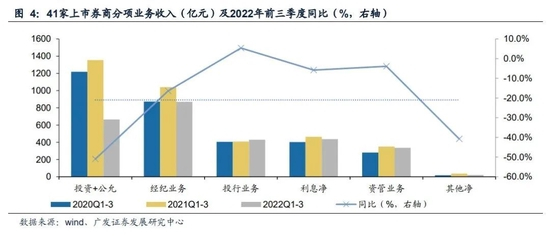 分业务看,41家上市券商各业务线业绩均不同程度下滑,自营拖累显著,投行业务逆势增长。2022前三季度,41家上市券商实现经纪业务净收入869.58亿元,同比-16.4%;投行业务收入429.98亿元,同比+5.4%;资管业务净收入336.10亿元,同比-3.9%;实现利息净收入436.36亿元,同比-5.8%;自营业务(投资收益+公允价值变动)实现收入664.16亿元,同比-51.0%;其他净收入20.97亿元,同比-40.8%。