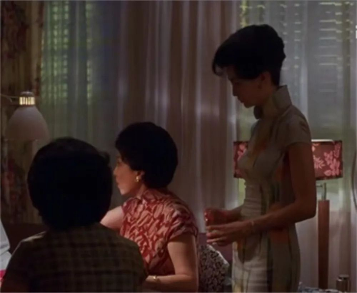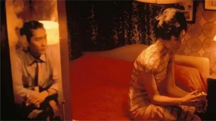 影片多次出现两人的擦肩而过。慢速镜头加上梅林茂的配乐,华尔兹节奏打底,像极了两人之间的情感进退,大提琴旋律突出,放大了人物与周围环境的格格不入和内心怅然。“我们不能像他们那样”,是苏丽珍的道德准则、世俗顾忌和逃避借口,张曼玉的过人之处在于能够通过极其细腻的表演和瞬间情绪变化的拿捏,对人物的丰富内心做出不同层面的展现。前一秒还漫不经心地用手指有意无意拨弄对方皮带,扮演挑逗别人丈夫的妻子,后一秒立刻陷入深深的不耻、自怜和哀怨。张曼玉在影片中的二十余套旗袍造型美不胜收,但与华美旗袍包裹下步态摇曳的身姿相比,她的眼睛更动人心魄,犹如孤夜星辰,璀璨夺目。苏丽珍在她的演绎之下,充满了一种无关肉欲的性感。她在外人面前的自我克制、谨小慎微和在周慕云面前的自然纯真、全然感性,形成了关乎“爱”的对比。她的性感是天真纯洁的,但同时又令人觉得遥远而脆弱,苏丽珍在情的滋生、绽放和自省、犹豫之间的摇曳充满了迷人的魅惑。