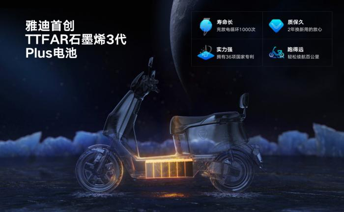 以第1000万台下线的雅迪冠能3 E9 PRO为例,其使用雅迪自己的TTFAR石墨烯3代Plus电池,在同样的电池体积下,容量提升约30%;旗下新国标电动自行车,第一个达到了续航200公里。