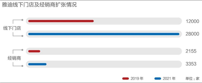 门店数量从2019年的1.2万家,扩充至2021年的2.8万家;经销商数量从2019年的2155家,扩充至2021年的3353家,销售点超过28000多个,去年一年增加了10000多个。