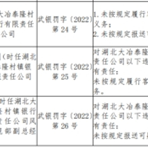 湖北大冶泰隆村镇银行被罚 大股东为浙江泰隆商业银行