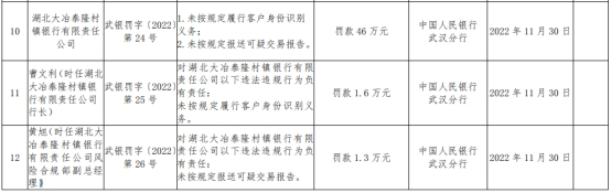 时任湖北大冶泰隆村镇银行有限责任公司行长曹文利对湖北大冶泰隆村镇银行有限责任公司以下违法违规行为负有责任:未按规定履行客户身份识别义务。中国人民银行武汉分行对曹文利罚款1.6万元。