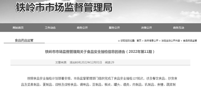 辽宁省铁岭市市场监管局关于食品安全抽检信息的通告(2022年第11期)